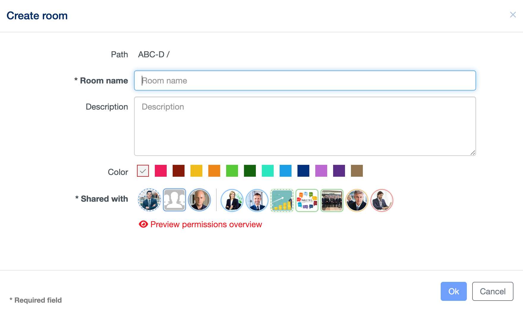 A Room acts like a classical file folder but offers much more capabilities: in fact, you can store there not only files, but also sub-rooms (to better organize your data), notes, events, discussions and much more.