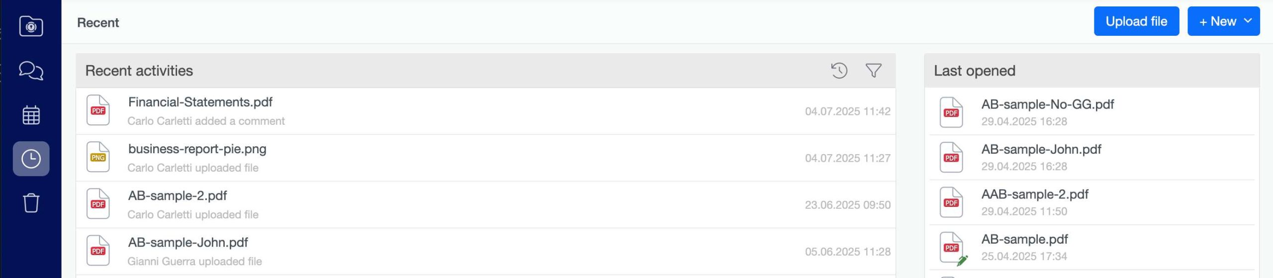 Under Recent activities you can see the timeline of all recent contributions inside your Trust Room (uploaded documents, created resources, new versions, new comments, …) and you have also a quick access the documents you have last opened.
