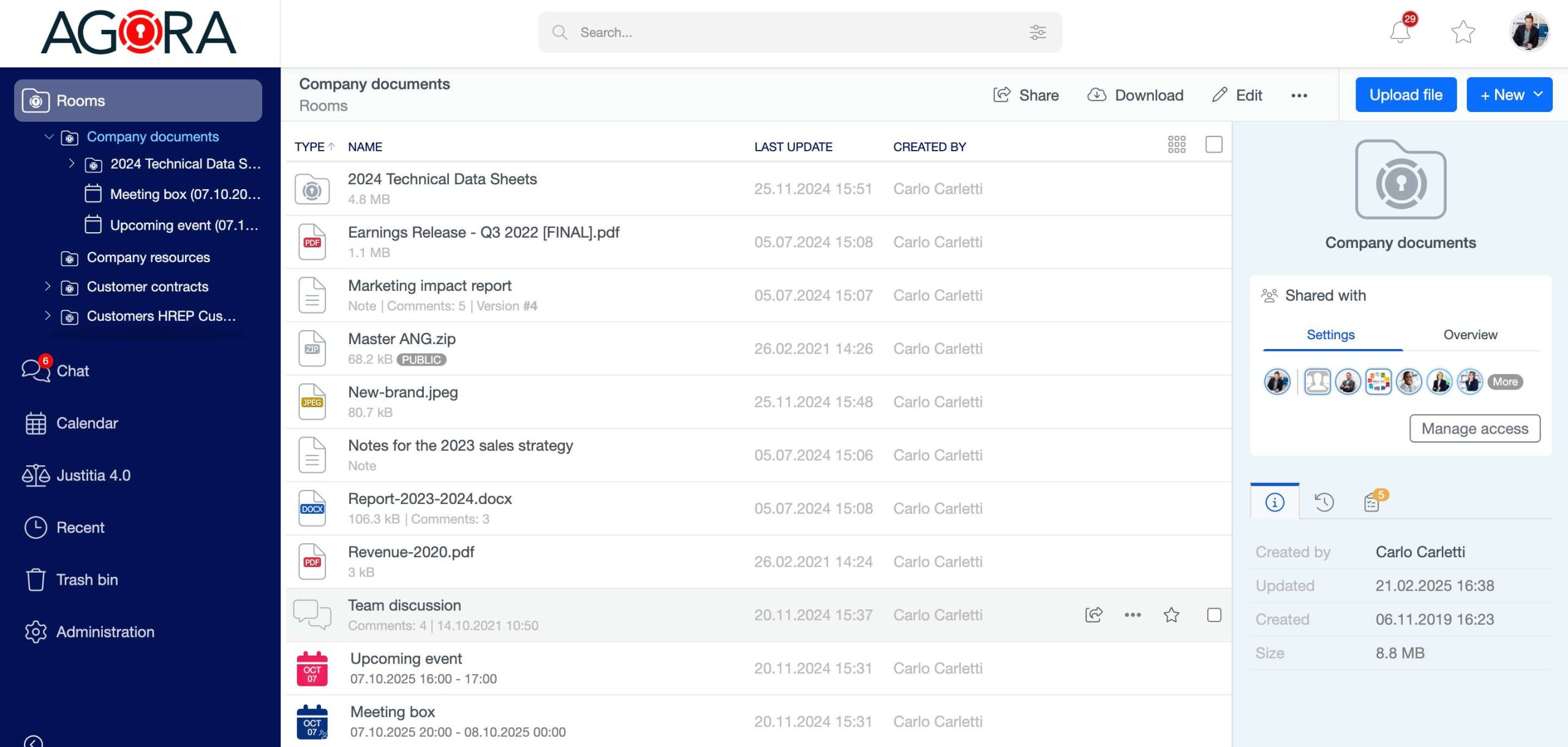 Inside this page you can browse all the information (Rooms, files, meetings, events, discussions, …) that were either shared with you or that you shared with others. You can drill down the rooms’ hierarchy either clicking on the single list’s elements or using the tree structure, displayed inside the navigation bar on the left.