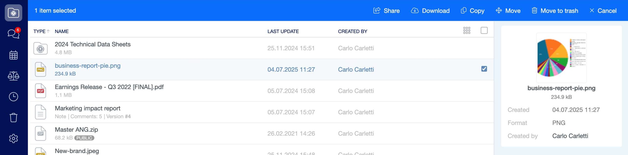 You are able to perform actions (like download, copy, move, delete) on multiple list’s elements by performing a multiple selection, that can be done either by manually check the element’s selection checkbox or holding Ctrl+Click (or Cmd+Click on Mac) and ranges with Shift+Click.
