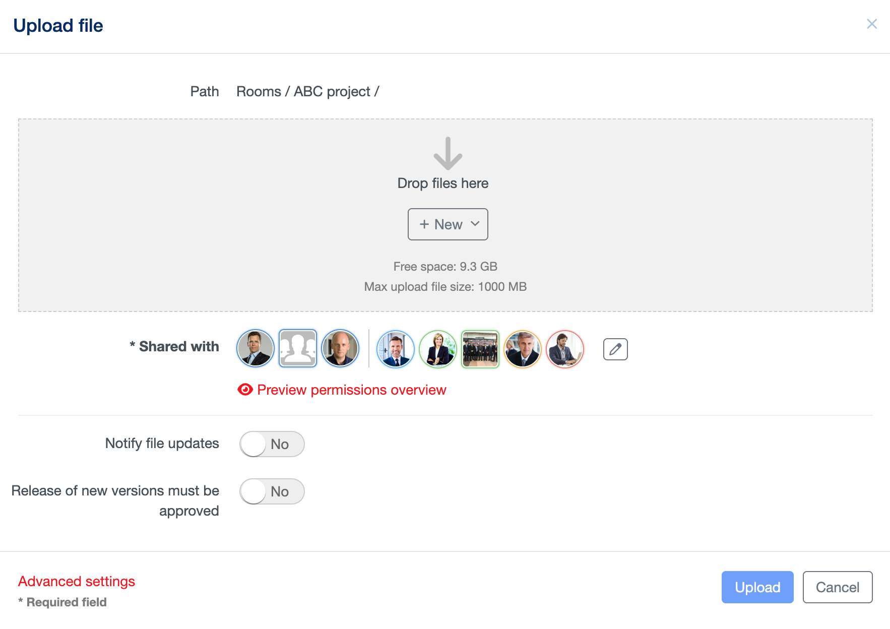 On the upload file form, in the most cases, you can simply confirm your action with “Upload” (since all the settings are inherited from the room).